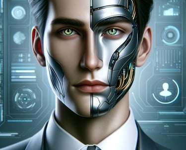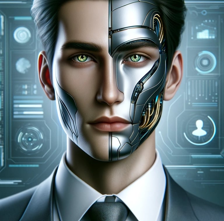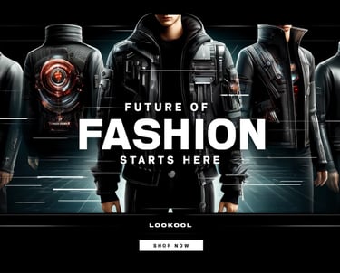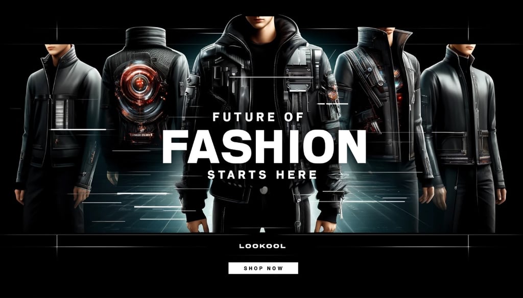 Models wearing futuristic clothing in dark tones, created with artificial intelligence for innovative fashion design.